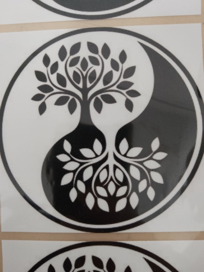 A close-up photograph displays a circular, stylized black and white graphic design, positioned in Gorna Oryahovitsa, Bulgaria. The central image depicts a tree integrated into a yin and yang symbol. The left, white section of the circle features a black tree with a trunk and numerous branches bearing leaves. The right, black section of the circle shows white tree roots, also adorned with leaves. Both the tree and roots form a symmetrical, intertwined pattern. The entire design is enclosed by a thin black circular border. This circular graphic is printed on a white, square or rectangular substrate, likely a sticker or label. Portions of identical designs are visible at the top and bottom edges of the frame, indicating a series of such items. A faint, thin light-brown horizontal line appears below the main design, separating it from the subsequent one. The background is a flat, light-colored surface.