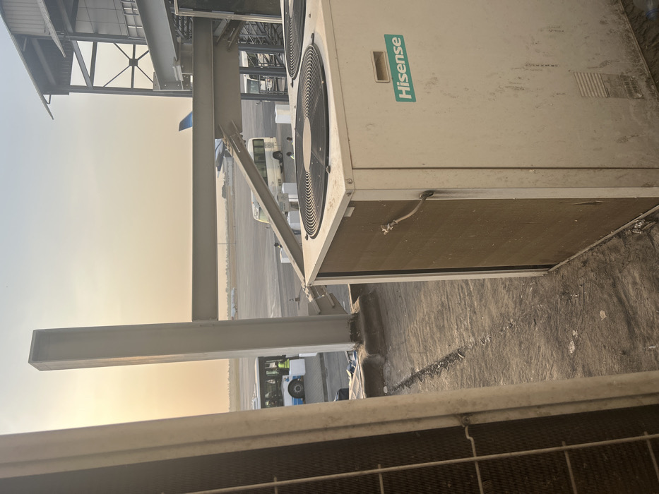 The image depicts an airport environment in Unknown, Nigeria, viewed from an elevated outdoor platform, possibly a rooftop or service area. In the immediate foreground, two large outdoor air conditioning units are present. The unit on the right is a white Hisense brand model, visibly weathered and dirty, with two circular fan grates on its top surface and a refrigeration line connection on its side. Part of a similar, unidentified AC unit is visible on the far left. The ground directly beneath these units is a rough, dirty concrete or asphalt surface with scattered debris. Beyond the AC units, a prominent grey industrial steel structure, comprising thick vertical columns and horizontal beams, forms part of a building or overhead walkway. Through and beyond this structure, an airport tarmac is visible under a hazy, yellowish-orange sky, indicative of either sunrise or sunset. On the tarmac, a blue and white airport shuttle bus is parked, with at least one individual wearing a high-visibility yellow vest visible near its front. To the right of this, a white airport shuttle bus is also present. The tail fin of a large aircraft, possibly with light blue livery, is partially visible behind the steel structure on the right, indicating an airplane parked on the apron. Further in the distance, additional aircraft and airport infrastructure are faintly discernible. The tarmac itself is a grey paved surface with standard airport markings. No explicit actions or interactions are clearly discernible among the personnel or vehicles.