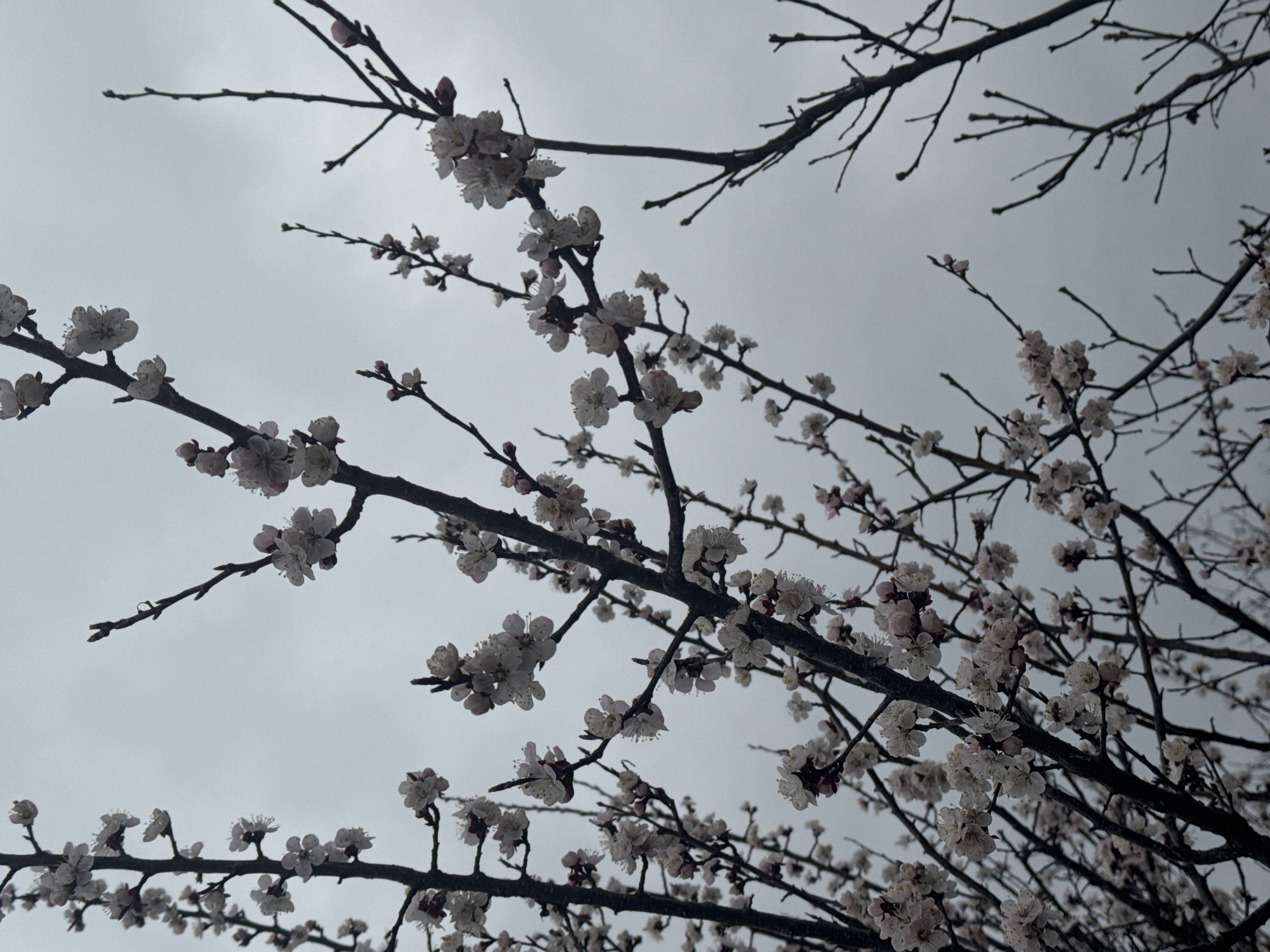 - "The image displays a dense arrangement of bare tree branches covered in numerous small blossoms, viewed from below against a uniformly overcast, light gray sky" by FM-fYcxL2, licensed under CC BY 4.0