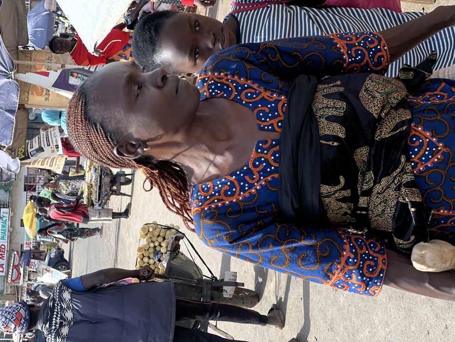 This image depicts a bustling outdoor street scene in what is identified as Gwong, Nigeria, under bright daylight conditions. In the foreground, an adult Black female with reddish-brown braided hair and small gold hoop earrings looks right. She wears a dark blue tunic with orange and white patterned embroidery, and a black sash over a section of fabric patterned with gold elephants. A light-colored handle of an object is visible in her right hand. To her right, a young Black child with a neutral expression looks forward, wearing a horizontally striped top. In the midground to the left, a Black male from behind pushes a grey wheelbarrow filled with numerous pale yellow spherical objects, likely produce. He wears a blue vest over a light blue shirt and dark pants. Further into the midground, a vendor operates a stall under a blue umbrella, displaying roasted corn or similar items on a cart. Several other individuals are visible in the background, engaging in various activities typical of a market or busy street. The background features a building with a prominent sign reading "LA MED PHARMACY" in red and green, along with other commercial signage, including a vertical "POS" sign. A light-colored vehicle is partially visible further back. The ground is paved, and the scene is illuminated by strong sunlight, indicating clear daytime weather.