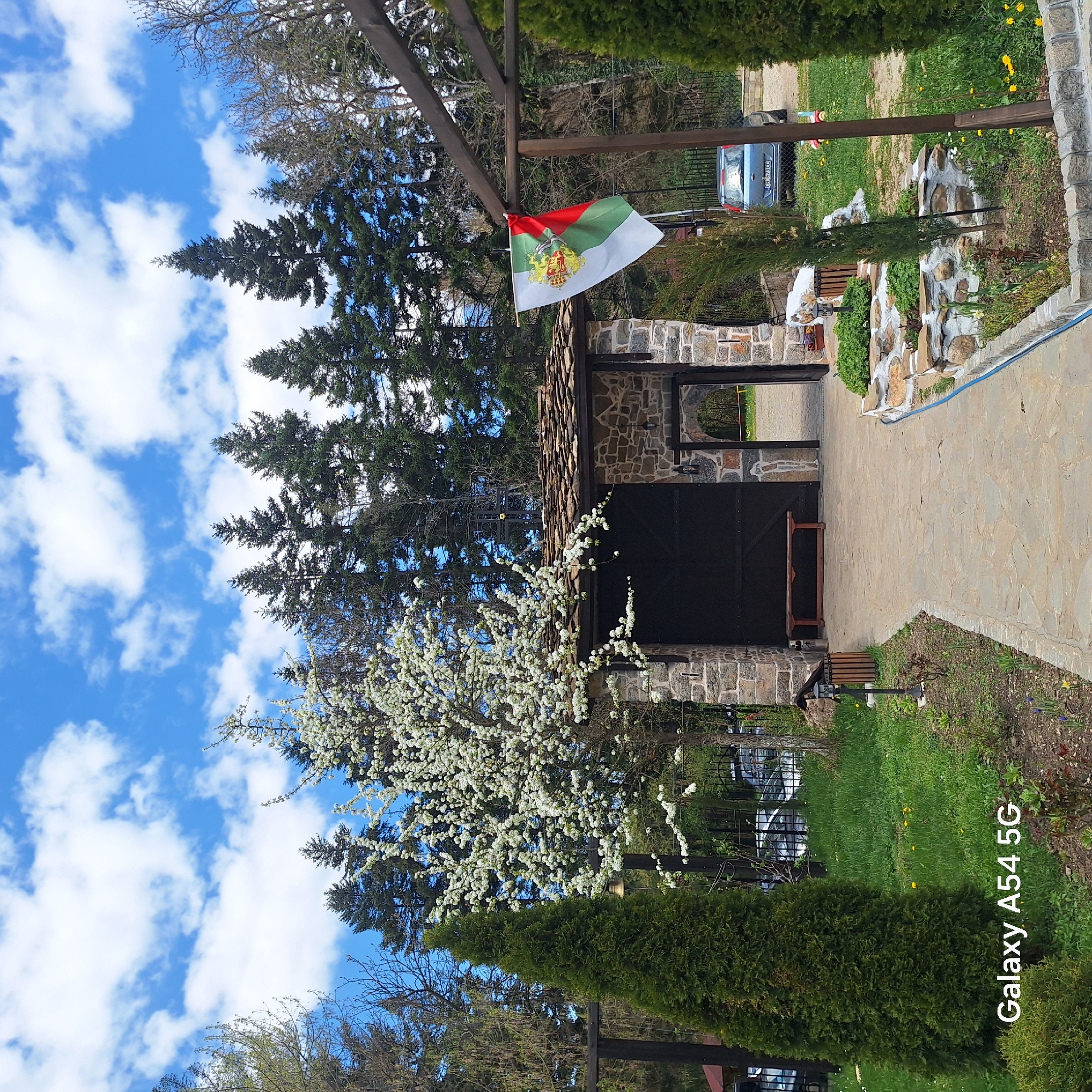 n outdoor scene in Iskrets, Bulgaria, featuring a stone gate structure adorned with the Bulgarian flag. A stone pathway leads through the gate, bordered by greenery, including grass, trees, and flowering plants. In the background, there is a car parked near a white structure. The sky is visible, with blue patches and white clouds.