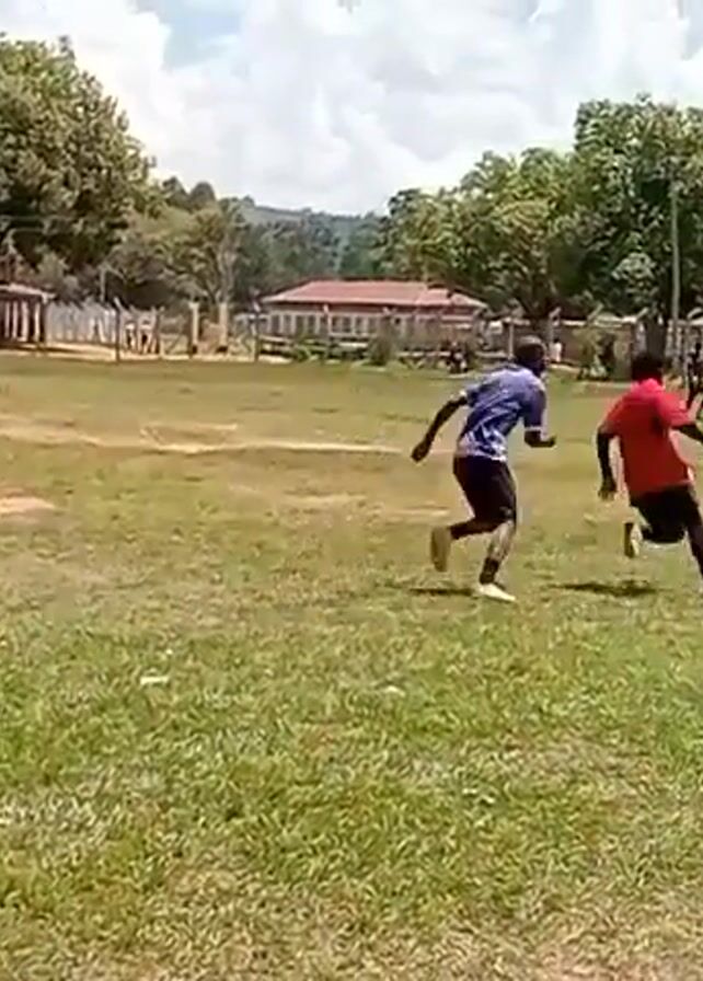 A medium shot shows a group of people playing soccer on a grass field. In the foreground, two players wearing red and blue jerseys are chasing after a soccer ball. The player in red has possession of the ball. Behind them, another player in a blue jersey is chasing after them. There are several other players scattered around the field. In the background, there are trees, buildings, and a fence surrounding the field. The sky is cloudy and the lighting is good.