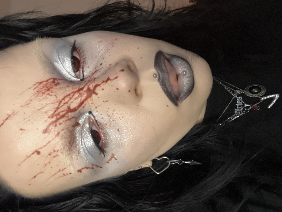 A close-up image depicts an individual with dark, long hair, lightened eyebrows, and a pale complexion, facing directly towards the viewer. The person's face is adorned with significant special effects makeup, including streaks and splatters of red liquid, resembling blood, across the forehead, nose bridge, and extending towards the temples and cheeks. The eyes feature shimmering silver eyeshadow, black winged eyeliner, and red eyeliner on the lower lash line, with red contact lenses giving the irises a uniform crimson appearance. The lips are painted with an ombré effect, transitioning from dark grey/black at the edges to a lighter, shimmering grey/silver in the center, and are slightly parted to reveal a portion of the tongue. The individual has multiple facial piercings: a labret piercing above the upper lip and a horizontal labret piercing on the lower lip, both featuring silver-toned barbells. The visible left ear (viewer's right) displays a silver-colored earring consisting of an open heart-shaped hoop from which a smaller, dark, conical pendant hangs. Around the neck, several silver-toned necklaces are worn, including one with an "Aries" pendant, another with a circular black stone, a third with a small red teardrop gem, and a fourth with a large, irregularly shaped silver pendant. The individual is wearing a dark, possibly black, garment. The background is an indistinct, light-colored surface, suggesting an indoor setting within the City of Zagreb, Croatia.