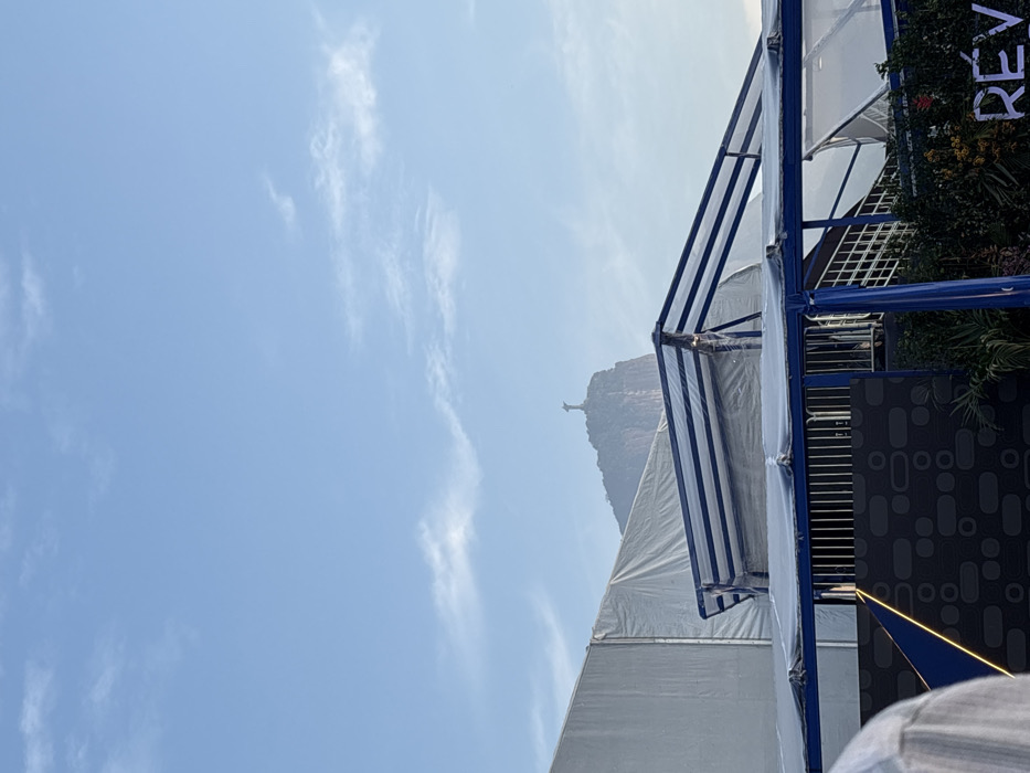 The image depicts a daytime scene in Rio de Janeiro, Brazil, featuring the Christ the Redeemer statue atop Corcovado mountain in the upper mid-ground. The sky is light blue with scattered wispy white clouds. In the foreground and mid-ground, a complex of temporary structures dominates the lower portion of the frame. To the left, a large, light-colored fabric or tarp-covered wall or tent structure is visible. Adjacent to it and extending towards the right is a structure with a blue metal framework and a translucent roof or canopy, featuring alternating horizontal blue and transparent strips. Below this canopy, a dark-colored panel with a geometric design of light-colored dots and blue triangles is present. To the far right, green foliage is visible, partially obscuring a dark surface with the illuminated letters "RÉV" in red-orange. A person's light-colored shoulder and upper arm are partially visible in the lower-left corner of the frame. No specific actions or interactions between individuals are discernible.