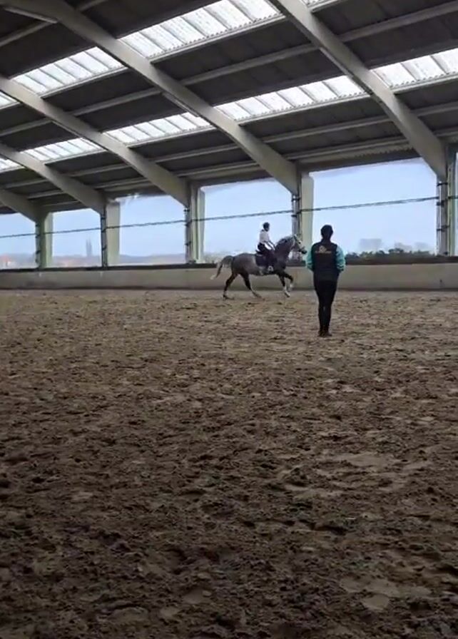 n indoor riding arena with a rider on a grey horse. The rider is wearing a helmet and light-colored top. The horse is trotting in a circle around the arena. There is a person standing in the arena who appears to be an instructor, wearing a dark jacket and pants with a teal or green shirt visible at the collar and sleeves. The arena has a sand floor and a metal roof with windows along the top of the walls. Outside of the arena are bare trees and a flat landscape.