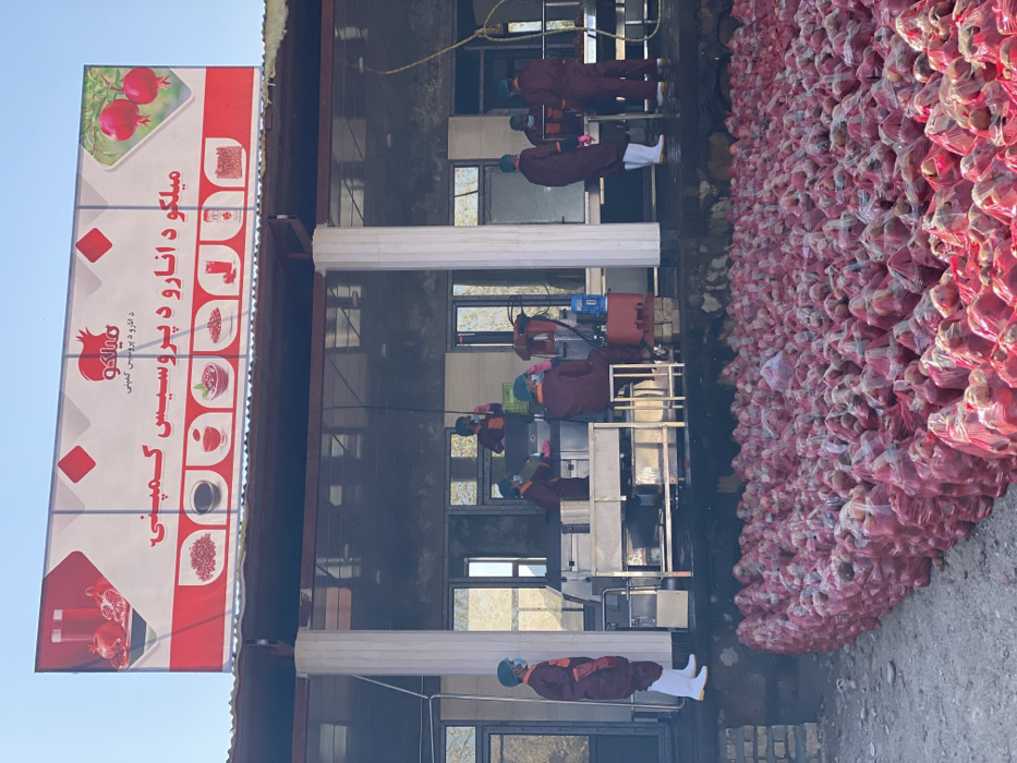 The image depicts an industrial outdoor processing facility identified as the "Milko Pomegranate Processing Company" in Sard-E 'olya, Afghanistan