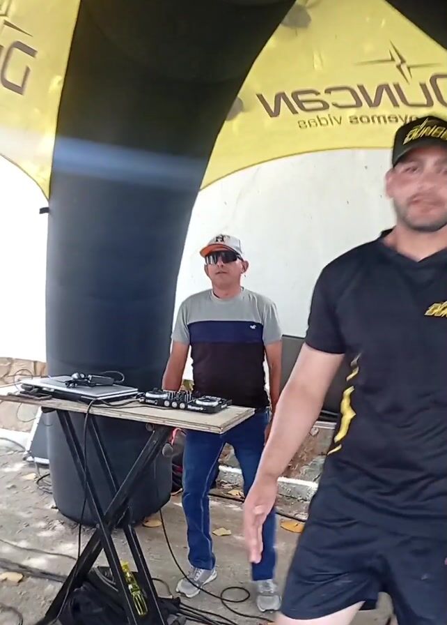 group of people underneath a large, black and yellow inflatable arch. The arch features the word "DUNCAN" in large letters, oriented in reverse. A table with electronic equipment is set up in the center of the frame, where a DJ in a gray and blue shirt and jeans is seen standing behind it, seemingly operating the equipment. The people around are wearing casual clothes and baseball caps, and are walking around the DJ setup. The surrounding ground appears to be concrete.