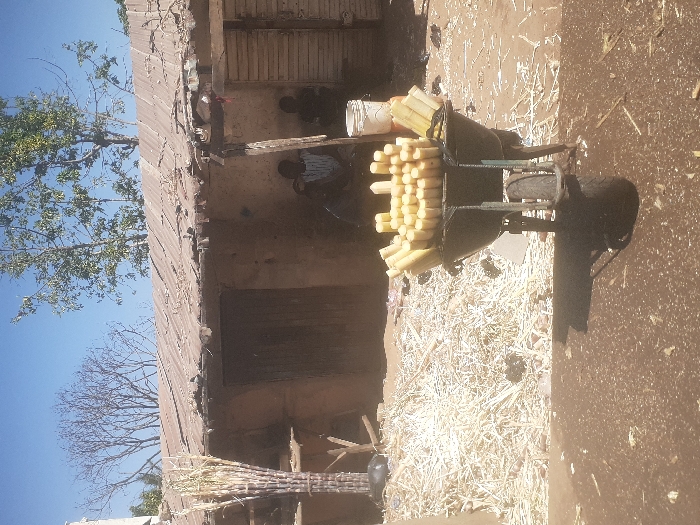 An outdoor scene, likely in a market or roadside area of Jos, Nigeria, depicts a vendor's setup in front of a modest, single-story structure. The building features light brown, unplastered walls and a weathered, corrugated metal roof. Two dark-colored wooden doors are visible, one partially open revealing two individuals seated in shadow inside. One person wears a light-colored, possibly patterned, shirt. In the foreground, a dark-colored wheelbarrow contains a large, orderly stack of approximately 50-60 short, light-colored cut sugarcane pieces, arranged vertically. To the left of the wheelbarrow, a substantial pile of light-colored, fibrous sugarcane waste (bagasse) covers the ground. Further left, a bundle of several tall, whole sugarcane stalks leans against a wooden post. The ground directly beneath the wheelbarrow and in the immediate foreground is a dark reddish-brown earth. The background shows a clear blue sky and two trees, one with bare branches and another with green foliage. A white bucket is visible near the seated individuals.