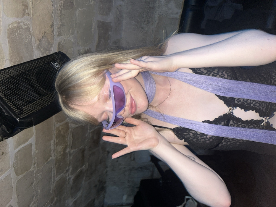 A fair-skinned young woman with blonde hair and bangs is depicted in an indoor setting in Paris, France. She wears purple wrap-around sports sunglasses, a black lace top with gold clasps, and a light purple textured scarf tied around her neck, revealing a thin gold chain necklace. A gold ring is visible on her left ring finger. She poses with both hands raised, her left fingers spread near her temple and her right hand near the frame of her sunglasses. Her eyes are closed, and her lips are slightly parted. The background features rough, light-colored stone or brick walls and a ceiling, characteristic of an old Parisian structure, with a black speaker mounted overhead and dark seating partially visible to the right.