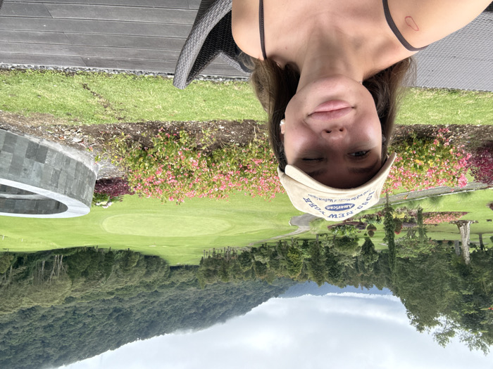 A selfie-style image captures a young adult female seated outdoors on a dark planked deck, overlooking a golf course in Wanagiri, Indonesia
