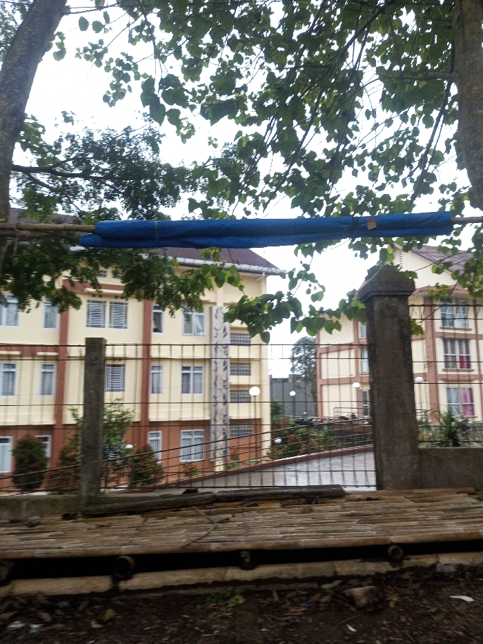The image captures an outdoor scene in Chagzam_Pam, Bhutan, under an overcast sky. In the immediate foreground, dark earth with minor debris is visible, topped by a horizontal structure composed of parallel light-colored wooden or bamboo slats, possibly a makeshift drain cover or path. Above this, a metal mesh fence with square grids is supported by concrete posts, one prominently visible on the right side. Beyond the fence, multiple multi-story buildings with light yellow facades and brown accent panels are visible, consistent with residential or institutional architecture. These buildings feature numerous rectangular windows, many equipped with white frames and horizontal security grilles. A sloped paved area or roadway, possibly wet, runs between the fence and the buildings, dotted with several globe-shaped streetlights. Small green trees and bushes are interspersed within the fenced area and around the building perimeters. Overhead, dense green foliage from tree branches frames the upper portion of the scene. Suspended horizontally across the upper mid-ground, a wooden pole is visible, attached to an unseen support on the left (likely a tree trunk) and extending towards the right. A central section of this pole is wrapped in blue tarpaulin or fabric, secured with visible blue binding material. No individuals are present, and no actions or interactions are depicted.