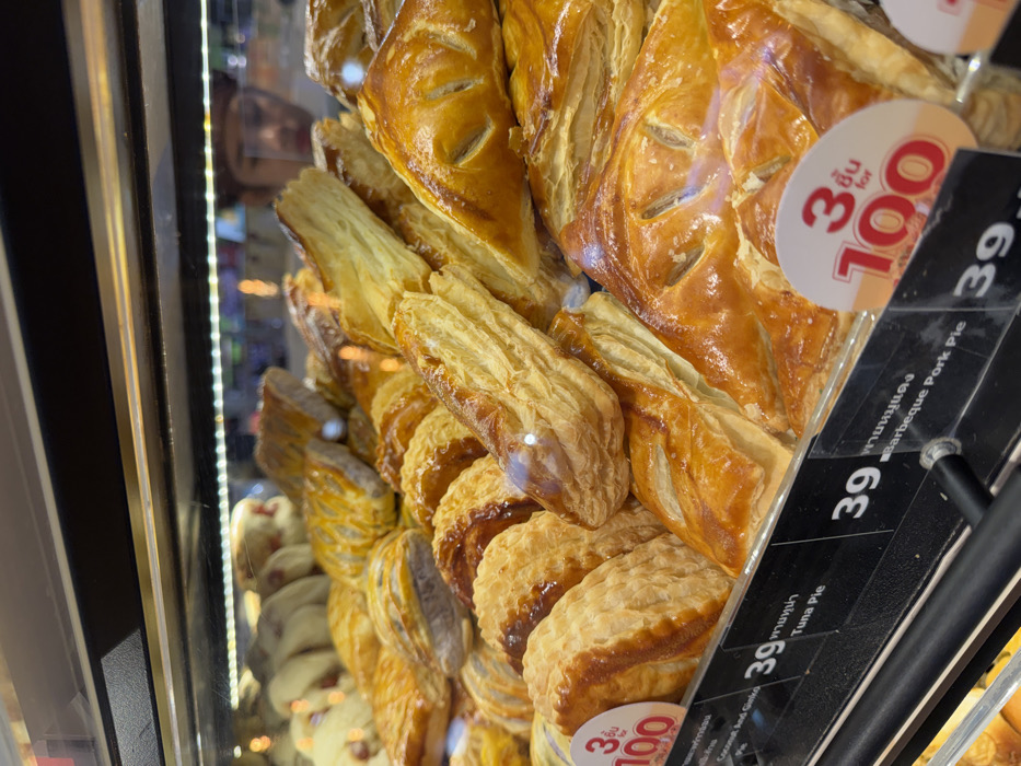 - "The image displays a close-up, eye-level perspective of a glass display case containing numerous golden-brown, flaky pastries in a retail environment in Wichit, Thailand" by FM-BQyrk1, licensed under CC BY 4.0