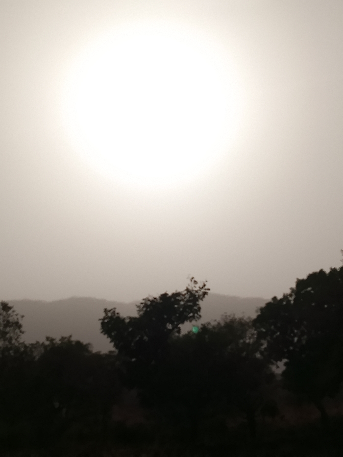 The scene depicts an outdoor landscape in the city of Gu, Nigeria. The upper half of the frame is dominated by a large, brilliant, diffuse white light source, identified as the sun, against a pale, desaturated beige-gray sky. This atmospheric condition suggests significant haze or dust. A distant, dark gray silhouette of undulating hills or mountains is discernible on the horizon, positioned below the bright light source. The foreground, occupying the lower half of the frame, consists of a dense, dark silhouette of trees and foliage. A small, distinct green light artifact is present within the tree canopy in the mid-right portion of the image. No human figures or artificial structures are overtly visible.