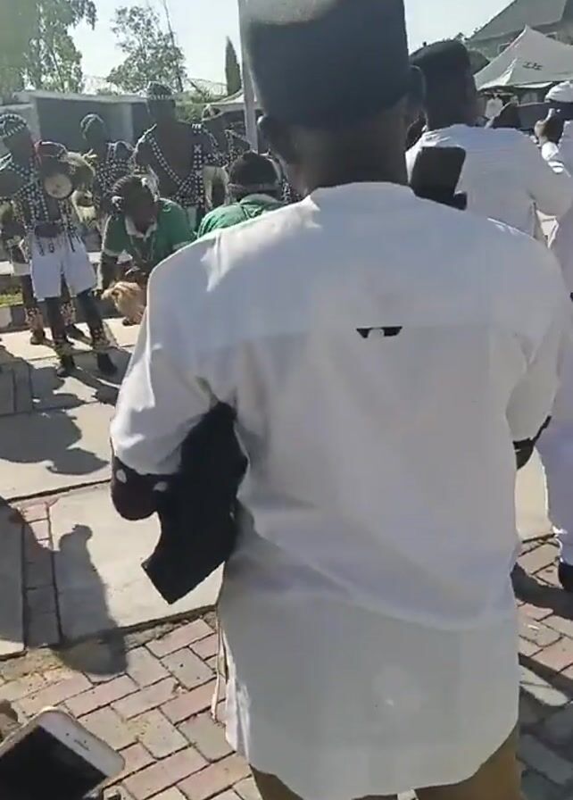 A group of people are performing a traditional dance outdoors on a paved area. The dancers are arranged in multiple rows. The women are wearing green shirts and patterned skirts, each holding a white feathered object. The men are wearing black and white patterned costumes and some are playing drums. The dancers are moving in unison. The performance takes place on a brick-paved area. There is a fence in the background and a few people observing from a distance. A person is filming the performance with a smartphone. Shadows of people nearby are visible in the foreground. It appears to be a sunny day.