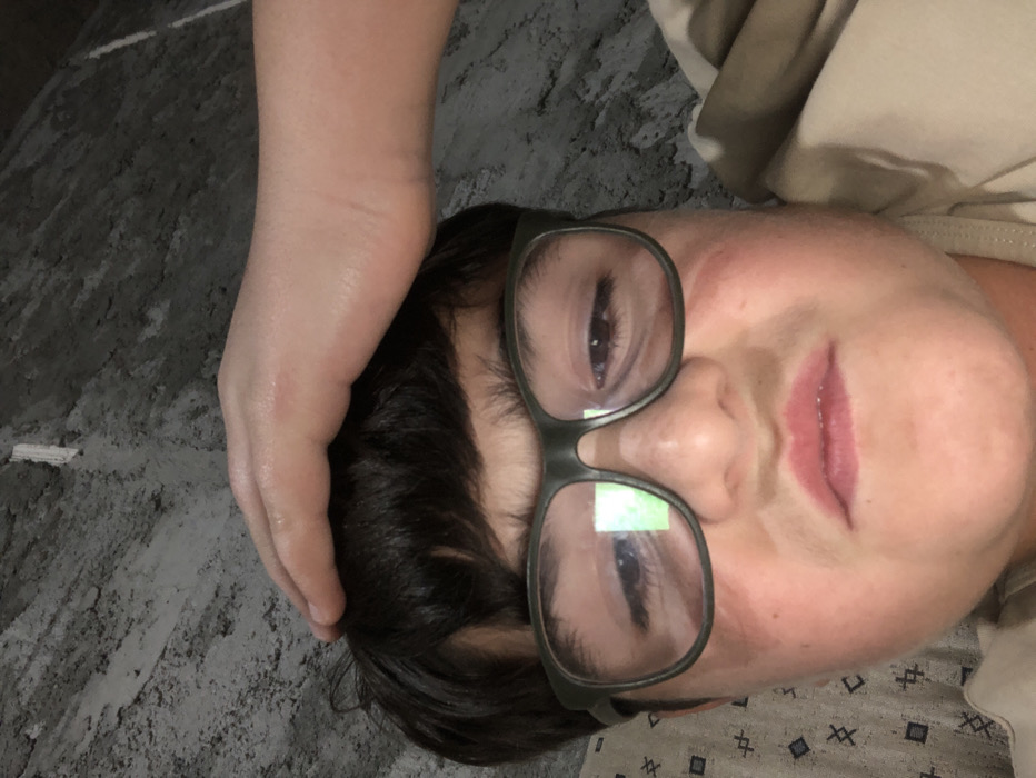close-up portrait of a young individual, likely a child or adolescent, positioned indoors. The subject has dark brown hair and is wearing olive-green framed eyeglasses, with a rectangular light reflection visible in the left lens. Their face displays light-toned skin, prominent cheeks, and reddish marks on both cheeks. The eyes are partially closed, with the left eye appearing more constricted than the right, and the lips are pressed into a slight downturned or pursed expression. A hand, matching the subject's skin tone, is placed on top of their head, with the palm and wrist area visible. The background is a grey, textured surface, possibly a wall, exhibiting an uneven, coarse finish. In the lower left quadrant, a beige or light brown fabric patterned with light squares containing diagonal crosses is visible. In the lower right quadrant, a plain, light-colored fabric, consistent with bedding or clothing, is present. The specific location within ქვედა სამება, Georgia, cannot be determined from the visual evidence in the image.