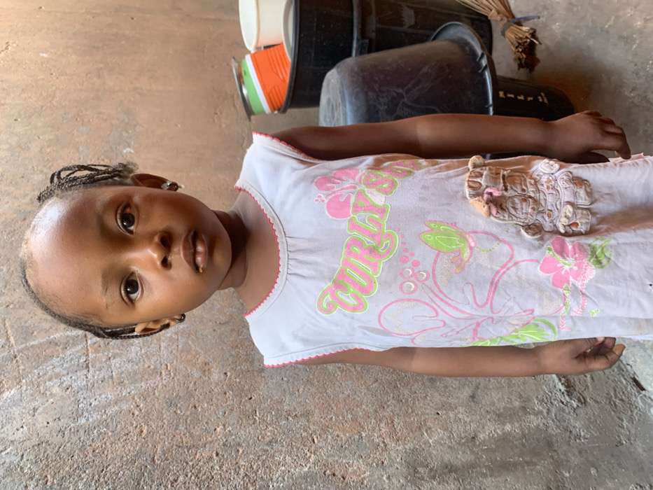 A young child, appearing female, stands centrally, facing forward in Okene, Nigeria