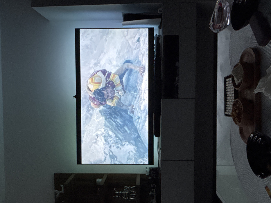 The image captures a dimly lit indoor residential setting, consistent with a living room or entertainment area. A large, wall-mounted or stand-mounted flat-screen television is centrally positioned, displaying a scene of a male individual actively climbing an icy, rugged mountain face. The man, with dark hair and a beard, is depicted wearing a multi-colored outfit, possibly a climbing vest or backpack, and exhibits an expression of intense effort. Below the television, a black soundbar rests on a dark-colored, multi-compartment entertainment unit. To the right of the television, a white PlayStation 5 console stands vertically. To the left, a segment of a shelving unit is visible, holding several decorative objects, including a clear, bear-shaped sculpture and a digital clock displaying "5:47". In the foreground, a transparent coffee table is present, featuring a textured placemat. On the placemat, a wooden tray contains two small bowls of snacks, one filled with what appears to be nuts or similar small food items, and the other with a lighter-colored granular substance. A small black tray with white rectangular game pieces is also on the table. Other items include a dark-colored mug or glass, crumpled white tissues, a clear, faceted glass ashtray, and a dark remote control. The primary illumination in the room emanates from the television screen, casting a cool, ambient light, supplemented by subtle bias lighting behind the display. No visual information is present within the image to identify the specific location within Gabrovo, Bulgaria.