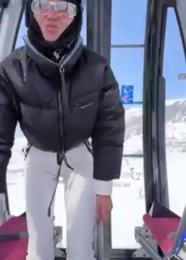 Inside a ski lift, a person wearing a helmet, goggles, a black balaclava, a black puffer jacket, and white ski pants is dancing. The person is facing the camera initially, and then turns around to face the window of the ski lift, where a snowy mountain landscape is visible. The ski lift has red seats and a grey frame.