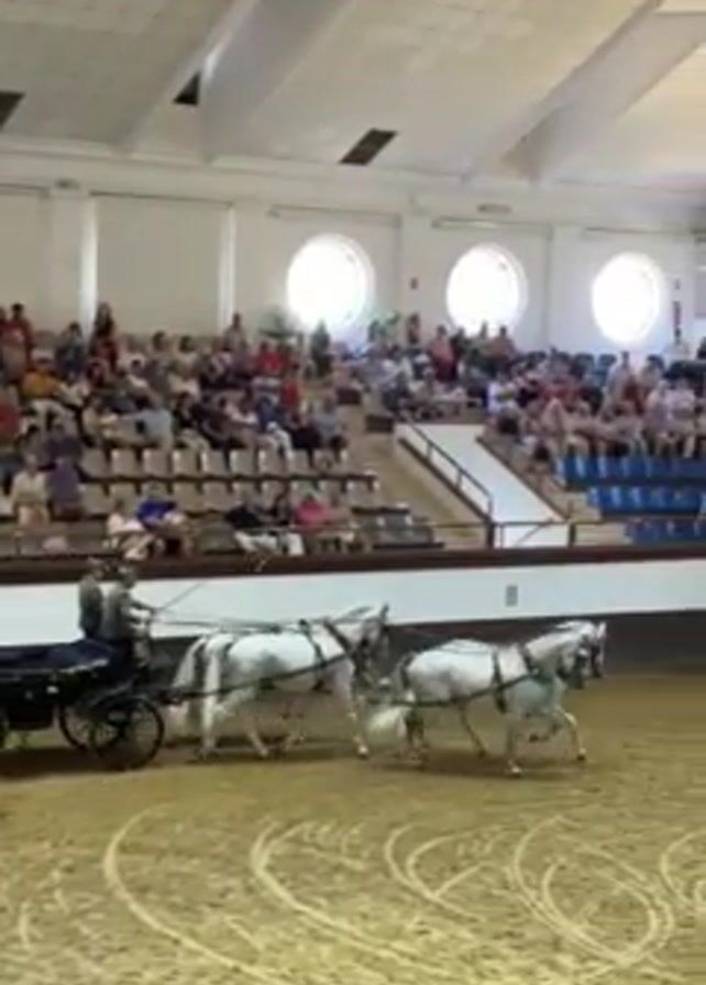 horse and carriage demonstration indoors, taking place in a large indoor arena with an audience seated in the stands