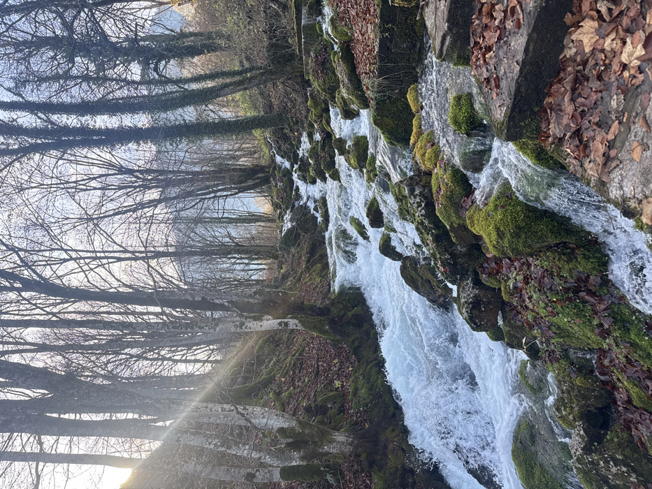The image depicts a natural landscape within the vicinity of Bistrica, Montenegro. The central feature is a turbulent river, identified as the Bistrica, cascading over numerous rocks, generating white rapids and aerated water as it flows from the upper right towards the lower left. The riverbed and banks are characterized by dark rocks, many extensively covered in vibrant green moss. Both sides of the river are lined by steep slopes densely covered with trees. These are predominantly deciduous, appearing bare without leaves, consistent with a late autumn or winter season. Sunlight emanates from the upper left, casting distinct rays through the sparse branches of the trees. The ground and visible rock surfaces are largely covered with brown, fallen leaves. On the far right bank, a stone-like, possibly man-made, stepped structure is partially visible beneath a layer of fallen leaves. No human figures, animals, or overt human activities are present within the scene. The sky, partially visible through the tree canopy, is light blue to overcast white.