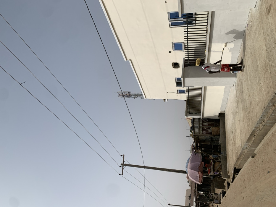 An outdoor daytime image depicts a street scene in Ado, Nigeria, under a hazy, light-blue sky