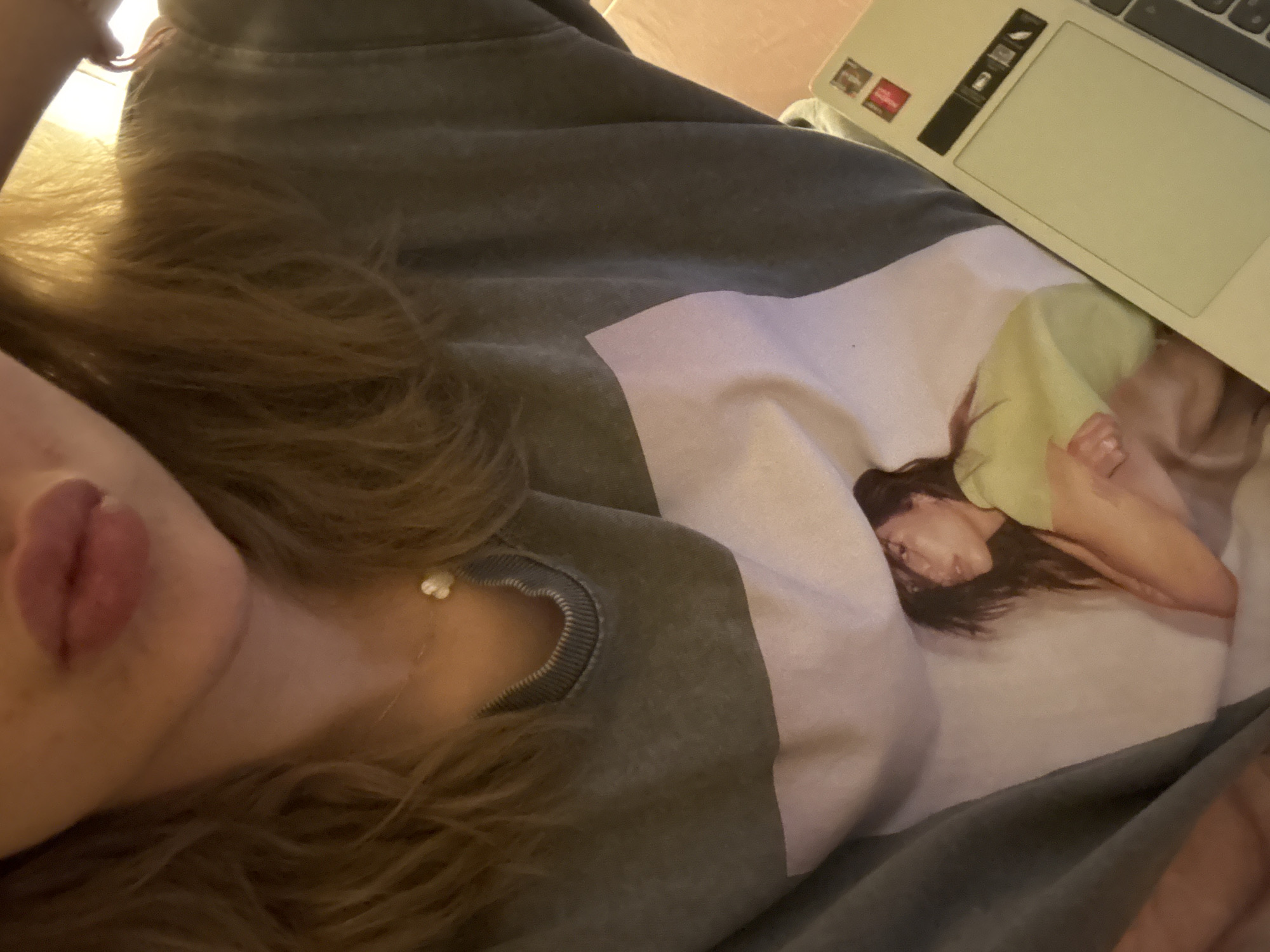 An indoor, close-up image shows the lower portion of a person's face, specifically the mouth and chin, with full, pinkish lips. Light-colored, wavy hair frames the visible facial area. A thin necklace with a small, white, clover-shaped pendant is worn around the neck. The individual is wearing a loose-fitting, dark grey or faded green sweatshirt with a ribbed collar. The front of the sweatshirt features a large graphic print depicting a woman with dark hair, wearing a light yellow top, positioned with her body angled and looking towards the right side of the frame. In the lower right foreground, partially obscured by the shirt, is a light-colored laptop, revealing its trackpad, a small section of the keyboard, and two small stickers on its upper bezel. The background is indistinct, indicating an interior setting with warm artificial lighting, and a reddish-brown surface is visible on the right side of the frame. The location is specified as L'hospitalet De Llobregat, Spain.