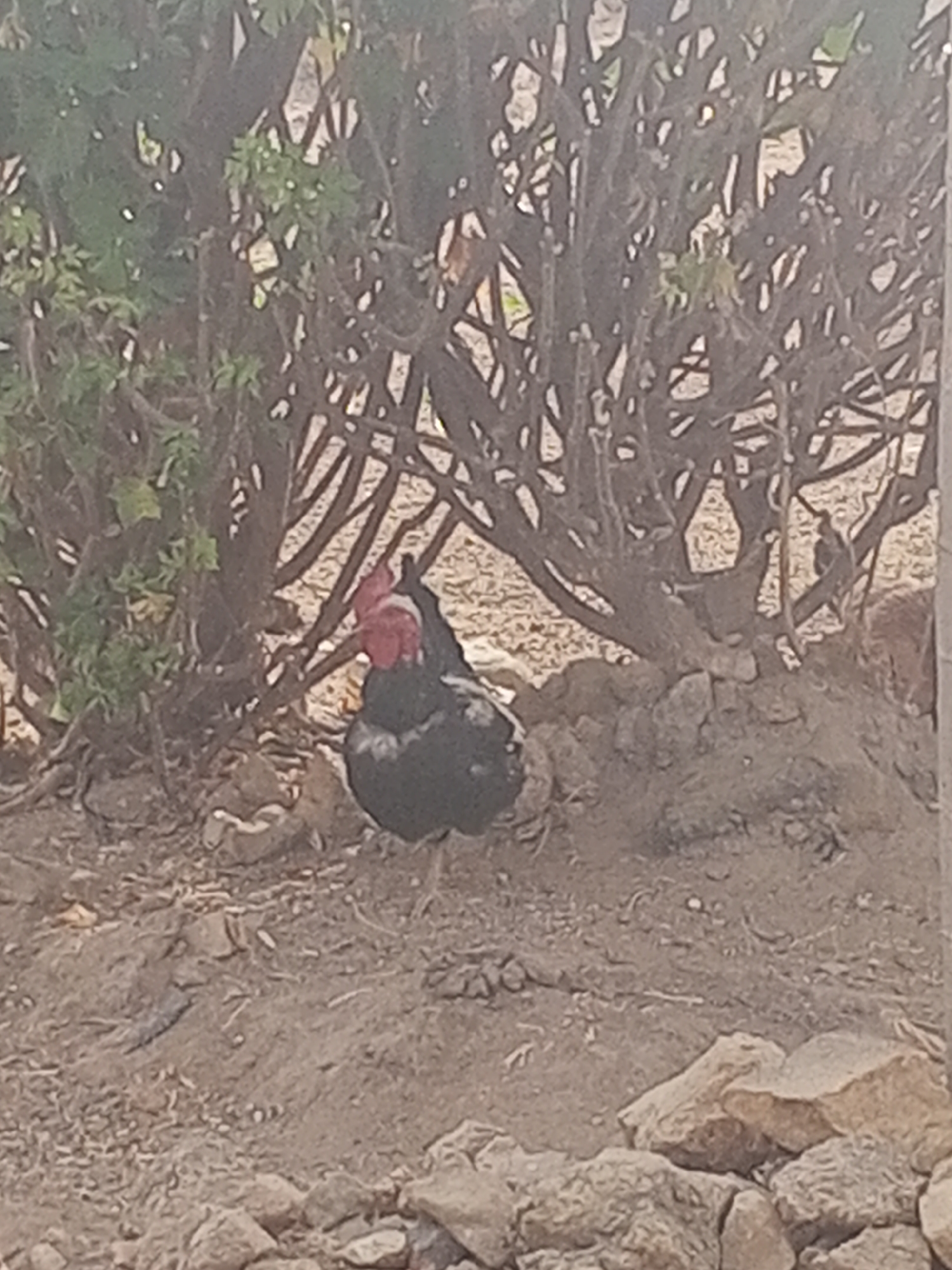The scene is located in Gura Top, Nigeria, depicting an outdoor environment. A black rooster with a prominent red comb and wattles is positioned centrally in the mid-ground, standing on light brown, dry soil and facing left. Behind the rooster, dense shrubbery with interwoven brown branches and sparse green leaves forms a backdrop, extending across the upper portion of the image. A small, greyish-brown lizard is partially visible on the ground to the lower-left of the rooster. The ground in the foreground consists of dry, dusty earth interspersed with scattered light-colored rocks and small stones. No human subjects or their direct interactions are present. The environment appears natural and characteristic of a semi-arid region.