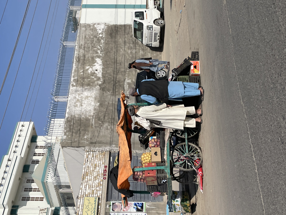 Three men stand beside a fruit cart laden with apples, oranges, and various crates. One man wears a light blue shalwar kameez with a dark vest, while another is clad in a white shalwar kameez. A third man stands partially obscured behind the cart. The cart has an orange tarp offering shade. A white van is parked nearby along a building, and the scene is set on a sunny street in a town.