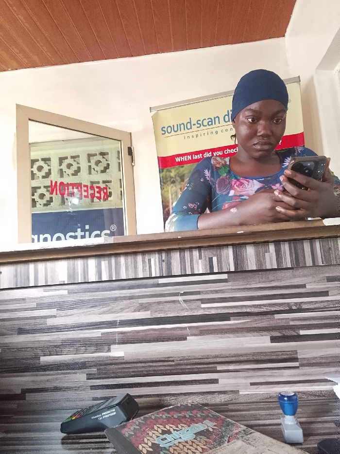 The image depicts the reception area of a diagnostic center in Lagos, Nigeria