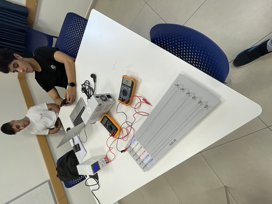 The image depicts an indoor scene within a modern classroom or laboratory, located in Unknown, Unknown. Two young adult males are seated at a white rectangular table with blue chairs. The male on the left, wearing a white t-shirt, and the male on the right, wearing a black t-shirt and a dark wristwatch, are both looking down at and operating their individual smartphones. The table is occupied by an assembled electrical experiment setup. A gray digital power supply unit, displaying "0.000 V" and "0.000 A", is connected via red and black wires to an orange and black digital multimeter. This multimeter is then connected by additional red and black wires to a second orange and black digital multimeter, which displays "1.021 V". The second multimeter's red and black alligator clips are attached to a gray rectangular "SAKLAB" board, which features four parallel conductor wires of specified diameters (0.20 mm, 0.30 mm, 0.40 mm, 0.50 mm) alongside ruler scales. Also present on the table are an open silver laptop, a black scientific calculator resting on a spiral notebook, and a gray rectangular power supply unit with a coiled power cable. A black backpack is placed on the blue chair to the left. The background consists of a white wall, a partial whiteboard on the left, and a blue curtain on the right. The floor is covered with light-colored tiles.