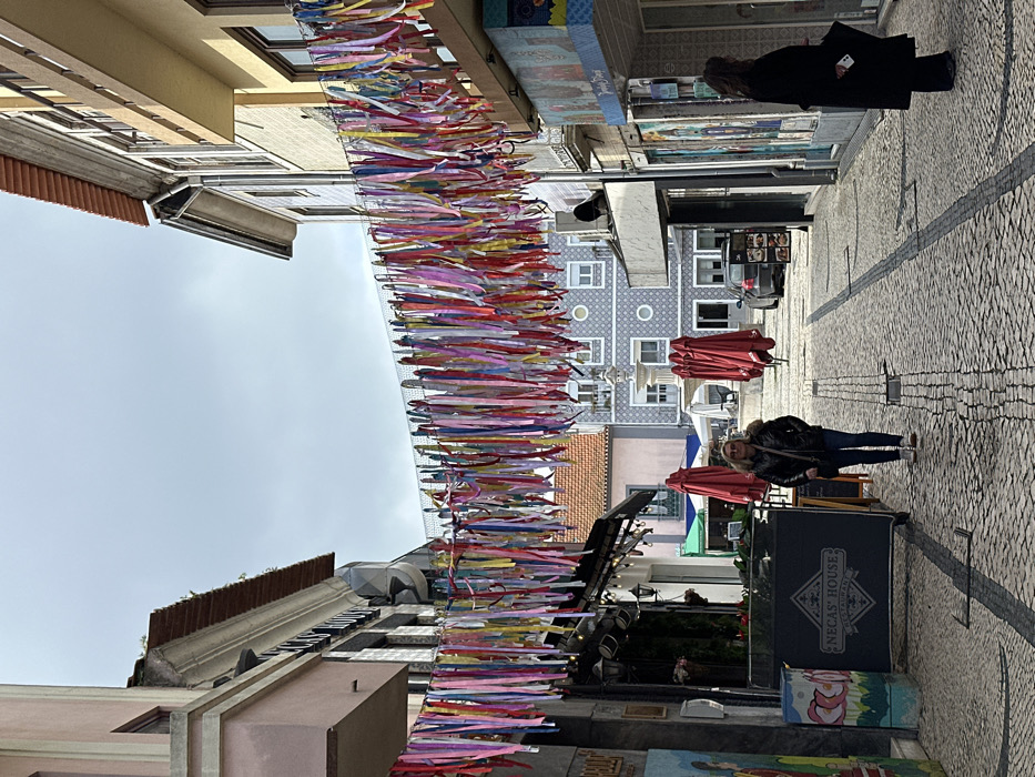 This image displays a pedestrianized cobblestone street in Aveiro, Portugal, under an overcast sky. Numerous multi-colored ribbons (including shades of pink, blue, yellow, red, green, purple, and orange) are strung horizontally across the street on multiple wires, forming a decorative canopy. On the left side of the street, a building with a light pink upper facade houses "NECAS' HOUSE RESTAURANT," identifiable by a black sign with white text. An outdoor dining area with dark tables, chairs, and a dark awning is present, with a partially visible colorful mural to the far left. On the right side, a yellow-walled building features multiple windows and balconies, with retail storefronts at street level, one displaying elements of blue and white patterned tiles. The street surface is composed of grey cobblestones, intersected by darker linear patterns. Two individuals are visible. In the mid-ground, a woman with blonde hair, wearing sunglasses, a black leather jacket with a fur-trimmed collar, blue jeans, and light-colored shoes, walks towards the viewer. She carries a dark shoulder bag. Further back on the right, a woman with dark hair, dressed in a long black coat, stands facing a shop window, holding a white object in her right hand. In the background, the street opens into a wider area or square. This area contains several closed red patio umbrellas, a multi-tiered stone fountain in the center, and buildings, including one with distinctive blue and white patterned "azulejo" tiles. A dark car is parked further back on the right side of the square.