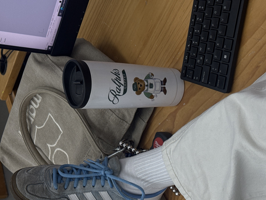 The image depicts a high-angle view of an indoor workspace, focusing on a person's lower leg and foot, desk items, and a computer. The setting is a light brown wooden desk or table. On the left, a person's left foot is visible, wearing a grey Adidas sneaker with three white stripes, light blue laces tied in a bow, and a white ribbed ankle sock. Light-colored (off-white) pants are seen above the sock. A keychain with multiple silver ball chain links and a red and black object (possibly a small measuring tape or utility device) hangs from the pants or shoe area. In the center, a light brown canvas tote bag with a partial white printed logo or text, resembling "mar", is positioned behind the foot. To its right, a white insulated tumbler with a black flip-top lid stands upright. The tumbler features the "Ralph's Coffee" logo in dark green script, below which is a cartoon bear character dressed in a green fedora, green sweater, white apron, and brown pants, holding a coffee cup. On the far right, a black HP computer keyboard with a Spanish layout (indicated by "Bloq Mayús" and "Alt Gr" keys) rests on the desk. Above the keyboard, a portion of a computer monitor screen is visible, displaying what appears to be a CAD or 3D modeling software interface with grid lines, axes, and numeric readouts. The scene portrays a casual, functional environment. The presence of a Spanish-layout keyboard is consistent with a location such as Mexico City, Mexico, although no specific landmarks or external features are visible to definitively identify the city or a precise location within it.