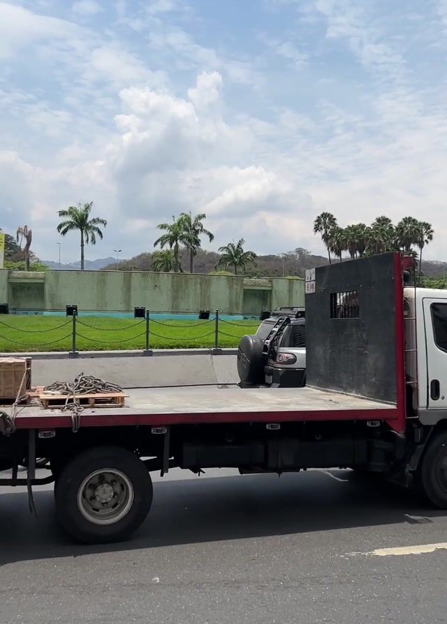 A flatbed truck drives on a road on a partly cloudy day. The truck is carrying a silver SUV, a pallet with a box, and some chains. A person wearing a helmet sits on the bed of the truck, attending to the restraints on the cargo. Palm trees and a grassy embankment are visible in the background. A billboard with yellow text stands beyond the embankment.