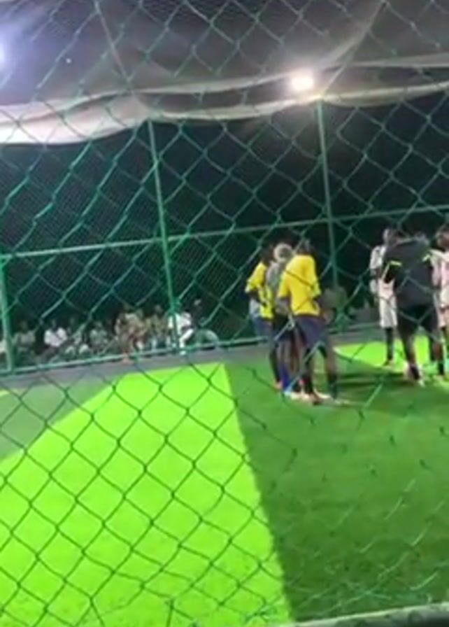 A soccer game appears to be on an artificial turf field. A small crowd is present, though the view is partially obstructed by a green netting fence. Two teams face each other, huddled for pre-game interaction. One team is wearing yellow jerseys and the other is in white. A referee is present in black and white. The lighting is bright and even.