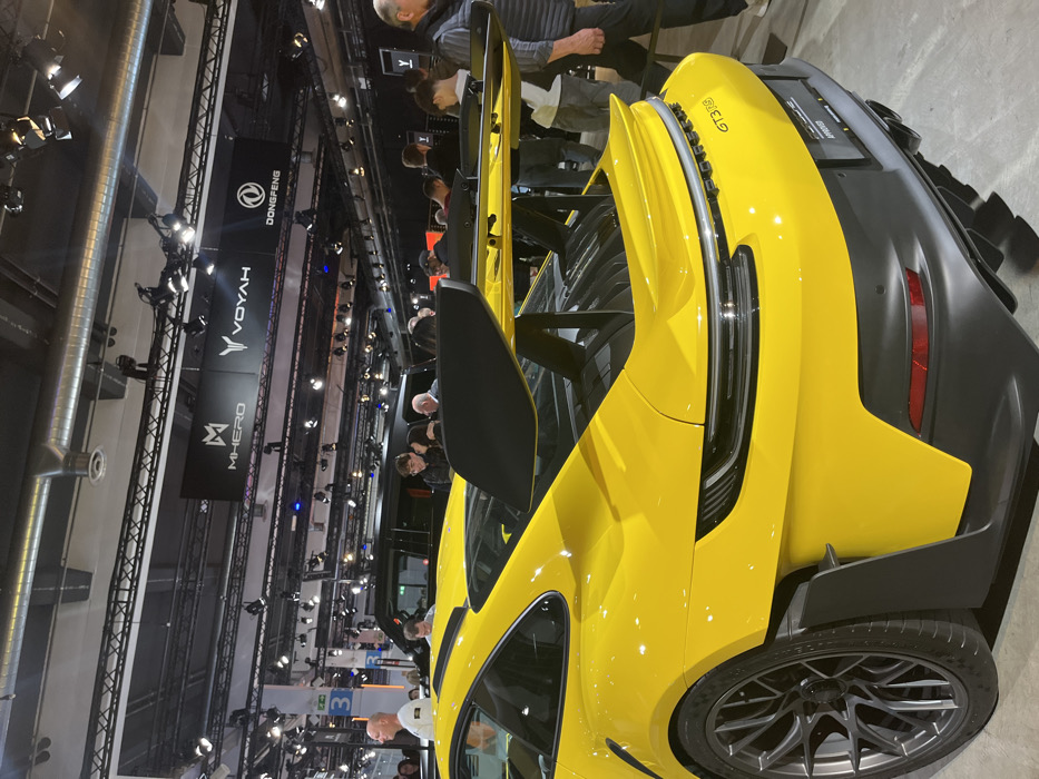 The image displays the rear-left quarter of a bright yellow Porsche 911 GT3 RS sports car, situated within an indoor exhibition hall at Messe Zürich in Zurich, Switzerland, likely during an automotive show. The vehicle features a large black swan-neck mounted rear wing, a black rear diffuser with dual central exhaust outlets, horizontal red taillights, and a dark grey multi-spoke wheel on the rear left. "PORSCHE" is lettered across the rear, with "GT3 RS" visible on the right. The background reveals an overhead truss system with multiple spotlights and exposed metallic ventilation ducts. Three black banners are suspended from the ceiling, displaying white logos for "MHERO," "VOYAH," and "DONGFENG." Several casually dressed individuals are scattered throughout the background, observing the exhibits. A dark-colored SUV or truck is partially visible behind the Porsche. The scene is brightly lit, indicative of a professional commercial exposition.