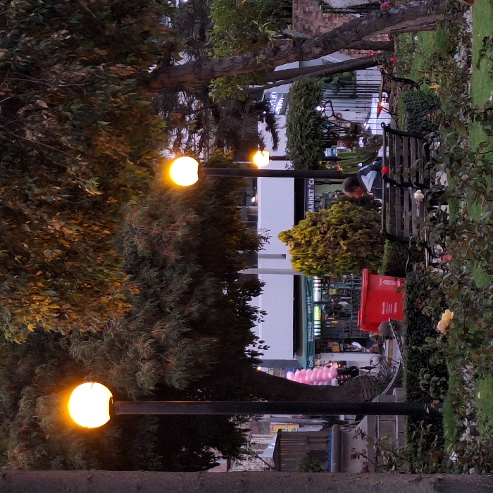 Two illuminated spherical lamps flank the left side of the image, trees dominate the lower left and upper sections. The backdrop features a building front with a "Market CI" sign visible. A person sits on a park bench amidst greenery, adjacent to a red trash bin. The view appears to be captured at dusk.