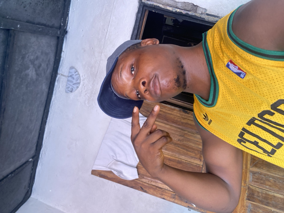 A male individual with dark skin, a short goatee, and a dark blue baseball cap is depicted in a close-up, selfie-style photograph. He is wearing a yellow sleeveless sports jersey with green trim, displaying "CELTICS" branding, an Adidas logo, and an NBA patch. His lips are slightly pursed, and his right hand is raised, forming a V-sign with extended index and middle fingers. The background features a light brown wooden door or panel to the left, with a white piece of fabric draped over it. To the right, a light-colored, textured wall is visible, along with a dark opening resembling a doorway. Above, a dark ceiling structure is present, and a small, semi-circular decorative element is attached to the upper wall/ceiling. The precise location in the city of Alaiyabiagba, Nigeria, cannot be confirmed from the visual information provided in the image, but the setting appears to be an interior or semi-interior space.