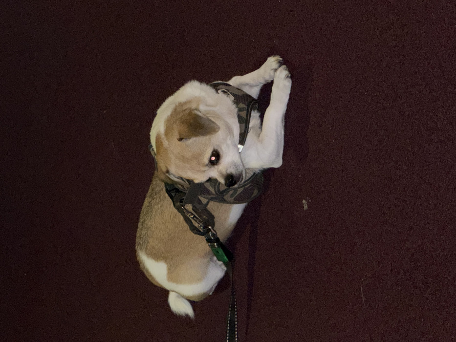 - "In Remscheid, Germany, a small, tan and white dog is depicted lying down on a dark red carpeted surface" by FM-xKTK43, licensed under CC BY 4.0