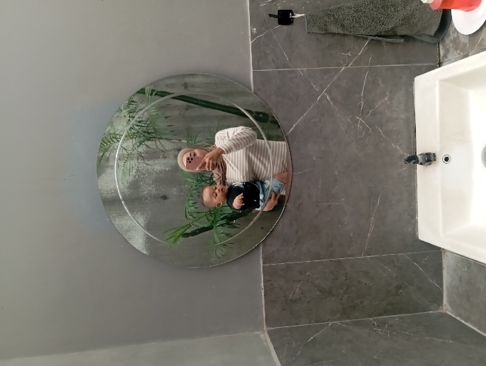 - "The scene depicts a mirror reflection of an adult female holding an infant, captured in a modern bathroom in Kecamatan Pati, Indonesia" by FM-McGNq2, licensed under CC BY 4.0