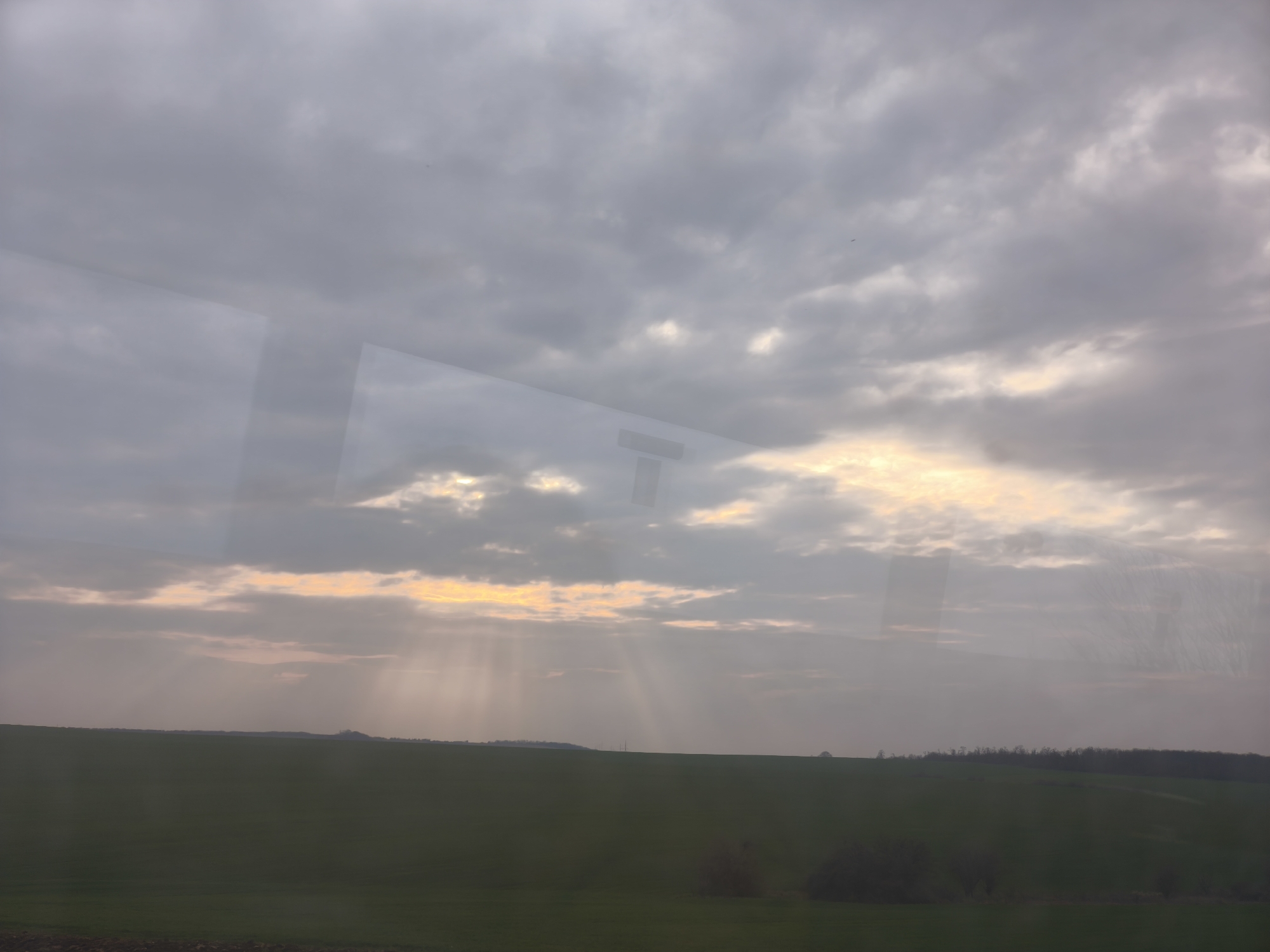 The image presents a rural landscape near Zgalevo, Bulgaria, viewed through a reflective surface. The upper two-thirds of the frame consists of an overcast sky dominated by grey clouds, with a discernible patch of yellowish-orange light on the lower right horizon, from which multiple crepuscular rays descend vertically. The lower third of the image is composed of a vast, gently undulating green field. A dark line of trees or dense vegetation is visible along the distant horizon. The reflective surface, likely a window, overlays the scene with abstract light and dark rectangular shapes, and faint, indistinct outlines, including a prominent 'T'-shaped reflection in the upper-middle sky. No discernible individuals or active subjects are present in the primary landscape.