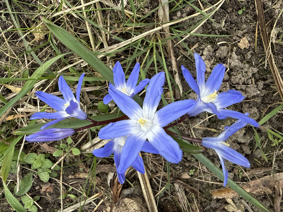 - "The image displays a close-up, top-down view of a cluster of blue, star-shaped flowers with white centers and yellow stamens, consistent with *Scilla* or *Chionodoxa* species, growing directly from the soil" by FM-Kliuo1, licensed under CC BY 4.0