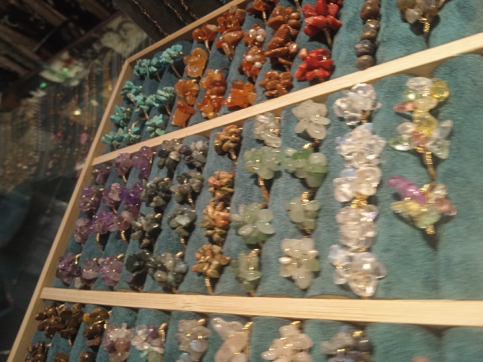 The image depicts a close-up, angled view of a retail display showcasing numerous handcrafted rings in Barza Municipality, Syria