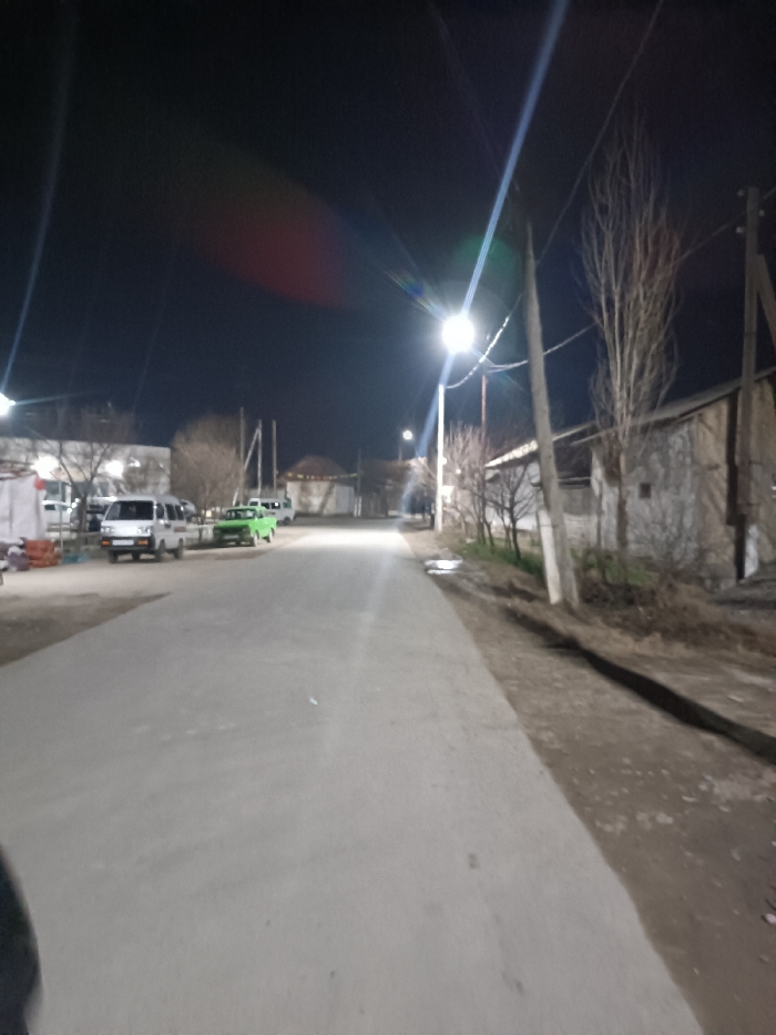 Night scene of a dimly lit street. Streetlights cast strong glares, illuminating the road. Several parked cars line the left side of the street. Buildings are visible on both sides, appearing old and worn. Trees are bare, suggesting winter or early spring. Power lines stretch across the sky between the utility poles. A narrow dirt shoulder runs along the right side of the paved road.