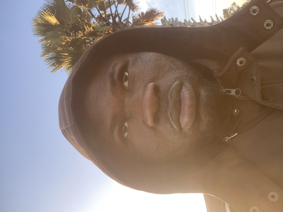 A close-up shot shows a Black man wearing a hooded jacket, tilted to the side. A palm tree stands in the background against a bright sky. Sunlight illuminates his face, highlighting his features. The hood is up, partially obscuring his forehead. The jacket is zipped to the neck.