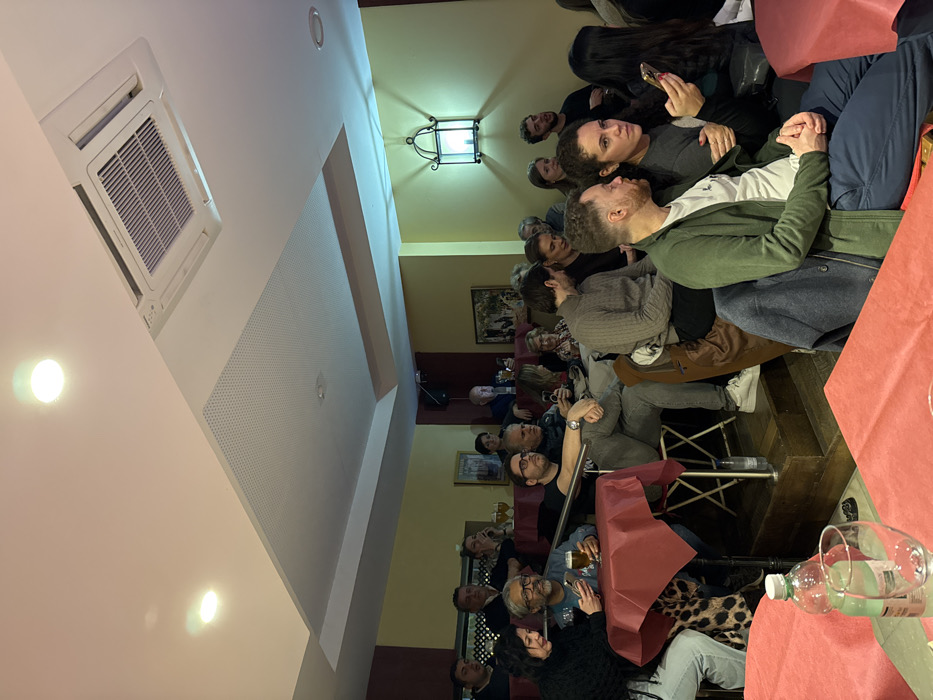 A gathering of people sits in a room, facing the same direction. Some are looking at phones, while others are engaged in conversation. A lantern-style light fixture is on the wall. A ventilation system is visible on the ceiling. Tables are covered with red cloths and scattered with glasses and a water bottle. The perspective is an angled, medium shot of the group in the restaurant space.