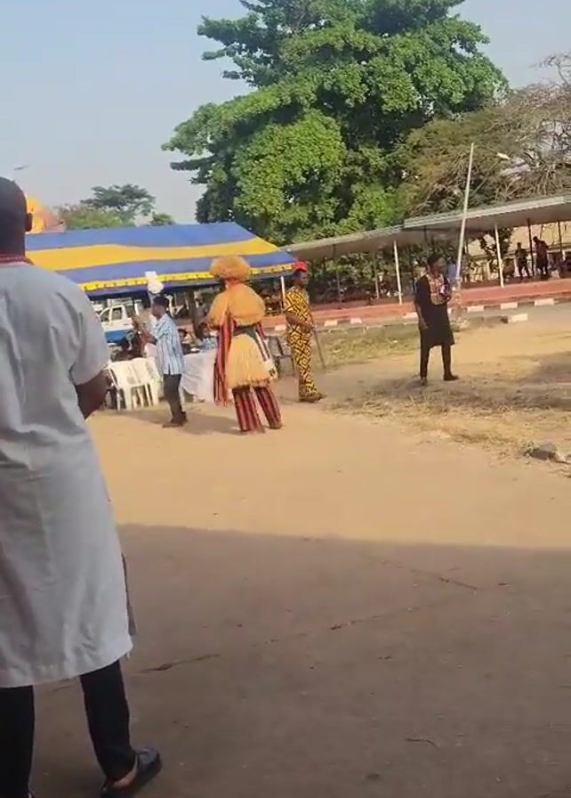 person in a traditional African masquerade costume walking on a dusty ground in an outdoor setting. The costume includes a straw-like headpiece, a skirt, and red-striped pants. A person in a patterned yellow and black outfit walks beside them. A man in a white shirt and black pants is standing in the foreground, with his back to the camera. In the background, there are people seated at a table under a blue and yellow tent. There are also trees in the background, and a covered walkway. The overall scene suggests a cultural event or performance.
