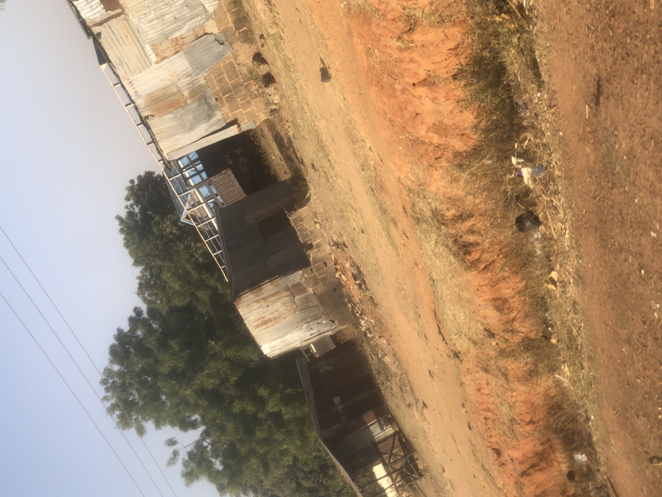A rural landscape shows a dirt road alongside dilapidated buildings with corrugated metal roofs. Some structures have visible brickwork and rudimentary framing. A large tree sits to the left, providing shade. The overall scene suggests a low-income area with basic infrastructure and dwellings. Power lines are visible in the sky.