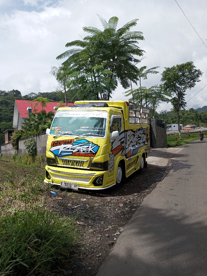 - "A bright yellow, highly customized light-duty truck with extensive graphic decals, including "NEW REBORN" on the front, is parked facing forward on the unpaved shoulder of a dark asphalt road in Ariyalai, Sri Lanka" by FM-UZQIf1, licensed under CC BY 4.0