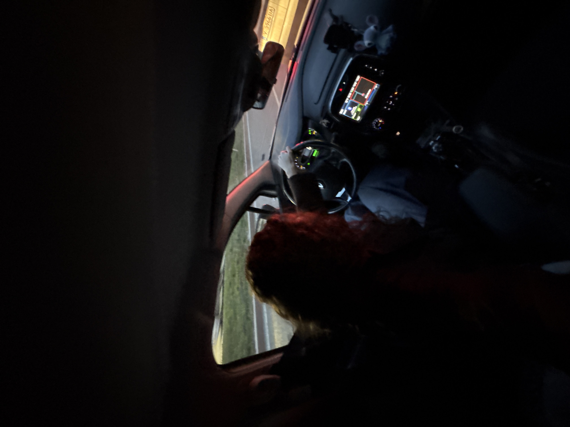 interior of a vehicle from the front passenger's perspective during dusk or nighttime
