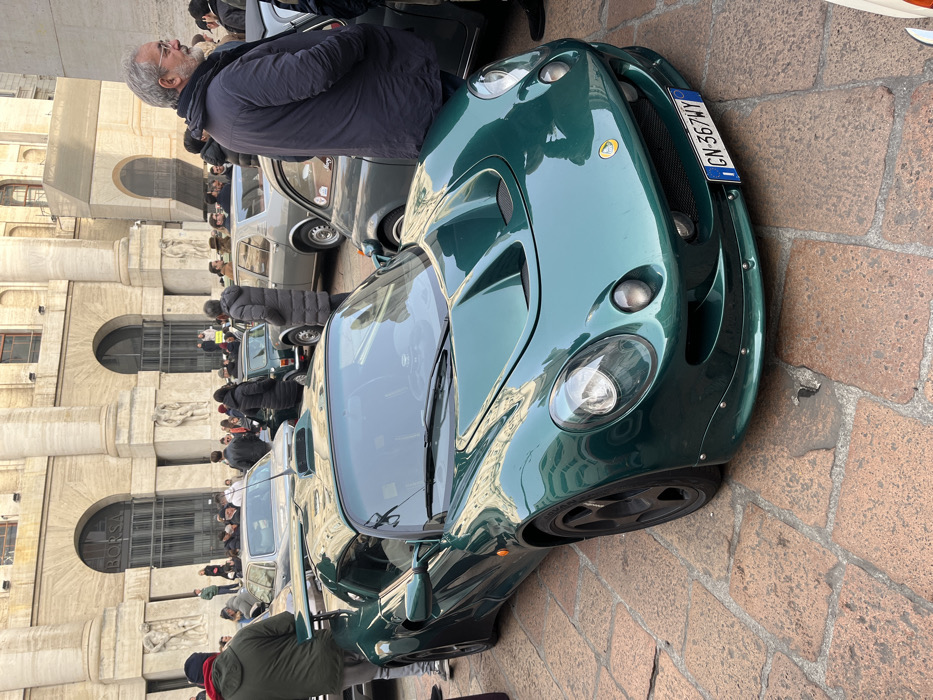 The image depicts an outdoor gathering of classic vehicles and people in Piazza Affari, Milan, Italy, specifically in front of the Palazzo Mezzanotte, which houses the Borsa Italiana (Milan Stock Exchange). The building's neoclassical facade with "BORSA" inscribed above an archway is visible in the background. In the foreground, a dark metallic green Lotus Elise sports car is prominently parked on a cobblestone surface. It features black multi-spoke wheels, a rear spoiler, and a roof-mounted air intake. The front of the vehicle displays a blue and white Italian license plate, "CN 367WY". Surrounding the Lotus are numerous individuals, predominantly adults, dressed in winter attire, observing the vehicles. A man with grey hair, glasses, and a dark overcoat stands on the right, facing left. Behind the Lotus, several other classic cars are visible, including a light grey sedan (possibly an Alfa Romeo), a green classic Mini Cooper, and a dark grey Fiat 500. The scene suggests a car show or exhibition under overcast daylight conditions.